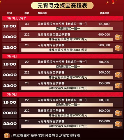 - 🎟️ 奖励:1张【22元宵寻龙探宝半价赛门票】